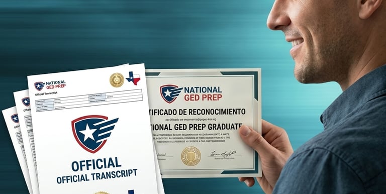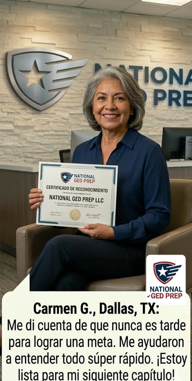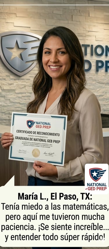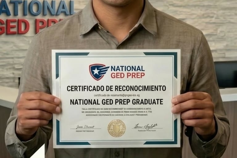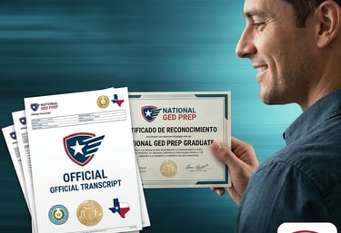 GED® es una marca registrada del American Council on Education (ACE) y es administrada por GED Testing Service LLC. National GED Prep LLC es una entidad independiente de tutoría y preparación; no está afiliada, respaldada ni aprobada por ACE o GED Testing Service. El diploma oficial de equivalencia de secundaria es otorgado exclusivamente por la autoridad educativa estatal correspondiente tras aprobar los exámenes oficiales.